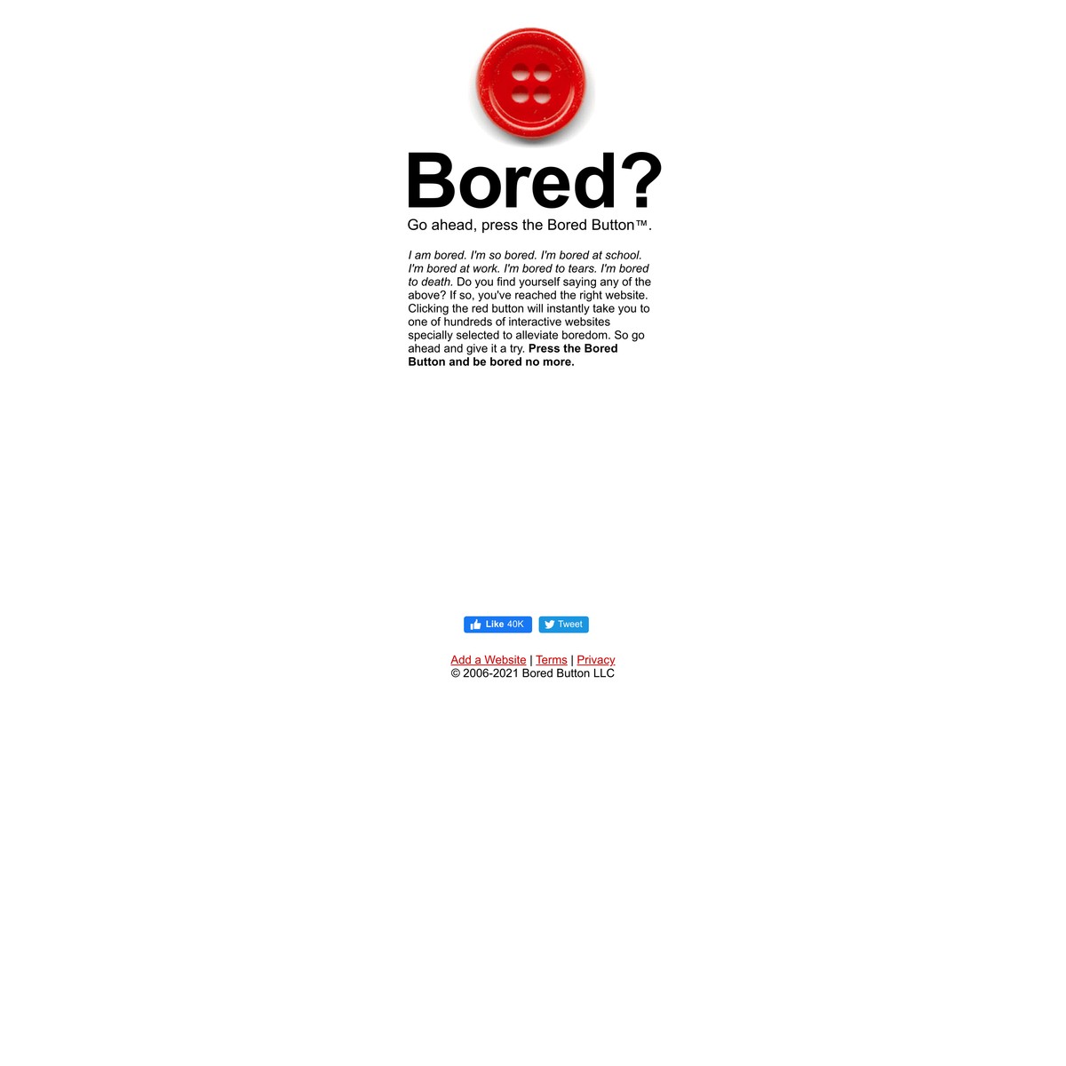A new addictive game will always be ready for you to play with every tap in just seconds. Take me to the next step. Try free for 1 month. When you ask yourself, take me to a useless website, just hit the bored button and start explori Do you find yourself saying any of the above? Spend bill gates' money $100,000,000,000. If so, you've reached the right website. Aug 05, 2017 · the bored button is like an edited version of stumbleupon, where every page is entertaining. Best useless websites is the web's best destination for finding random useless websites. 3.1 out of 5 stars 75. Paint your own nails simulator are you into your beauty? Ok, now mentally select a card, but don't click it! Clicking the red button will instantly take you to one of hundreds of interactive websites specially selected to alleviate boredom.
